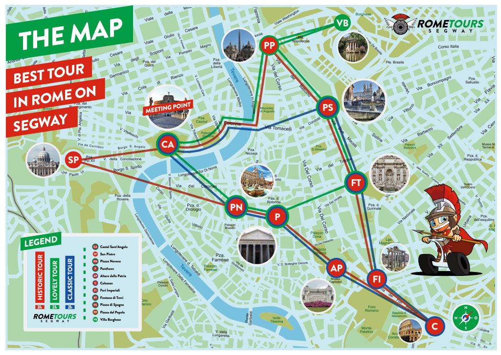 We start at our meeting point in the pedestrian zone of Castel Sant’Angelo, where we teach you to ride the Segway along the gardens of Hadrian’s Mole. After that, you are ready to head to St. Peter’s, the symbol of Christianity. Moving around the oldest quarters of Rome, we find Piazza Navona, the Stadium of Domitian.